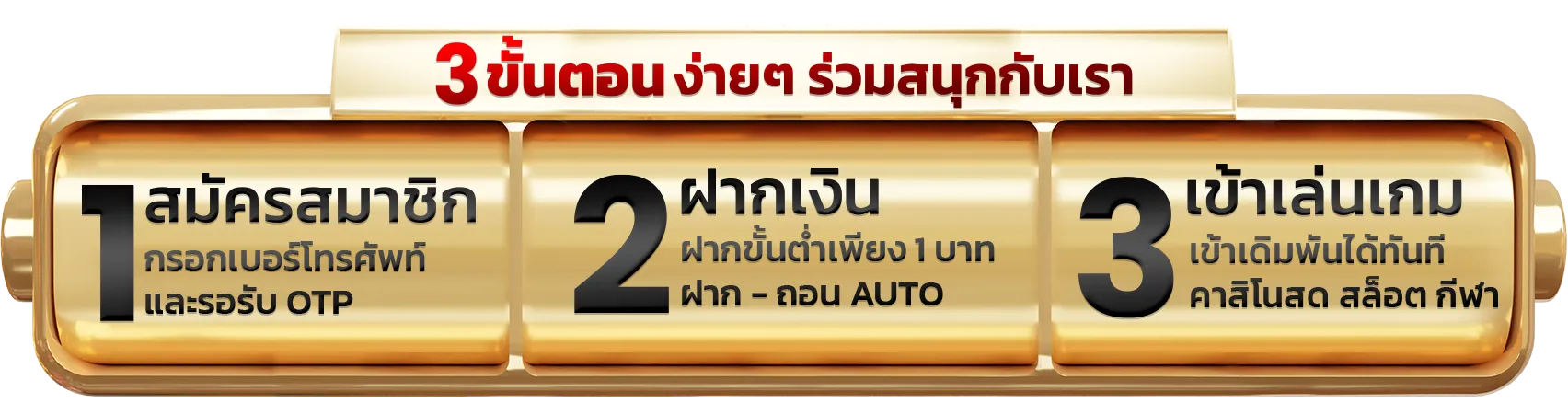 ตอบ : - กรอกข้อมูลส่วนตัวในแบบฟอร์ม - ยืนยันเบอร์โทรศัพท์ - เพิ่มบัญชีธนาคาร - รับ username/password - เริ่มเล่นได้ทันที
